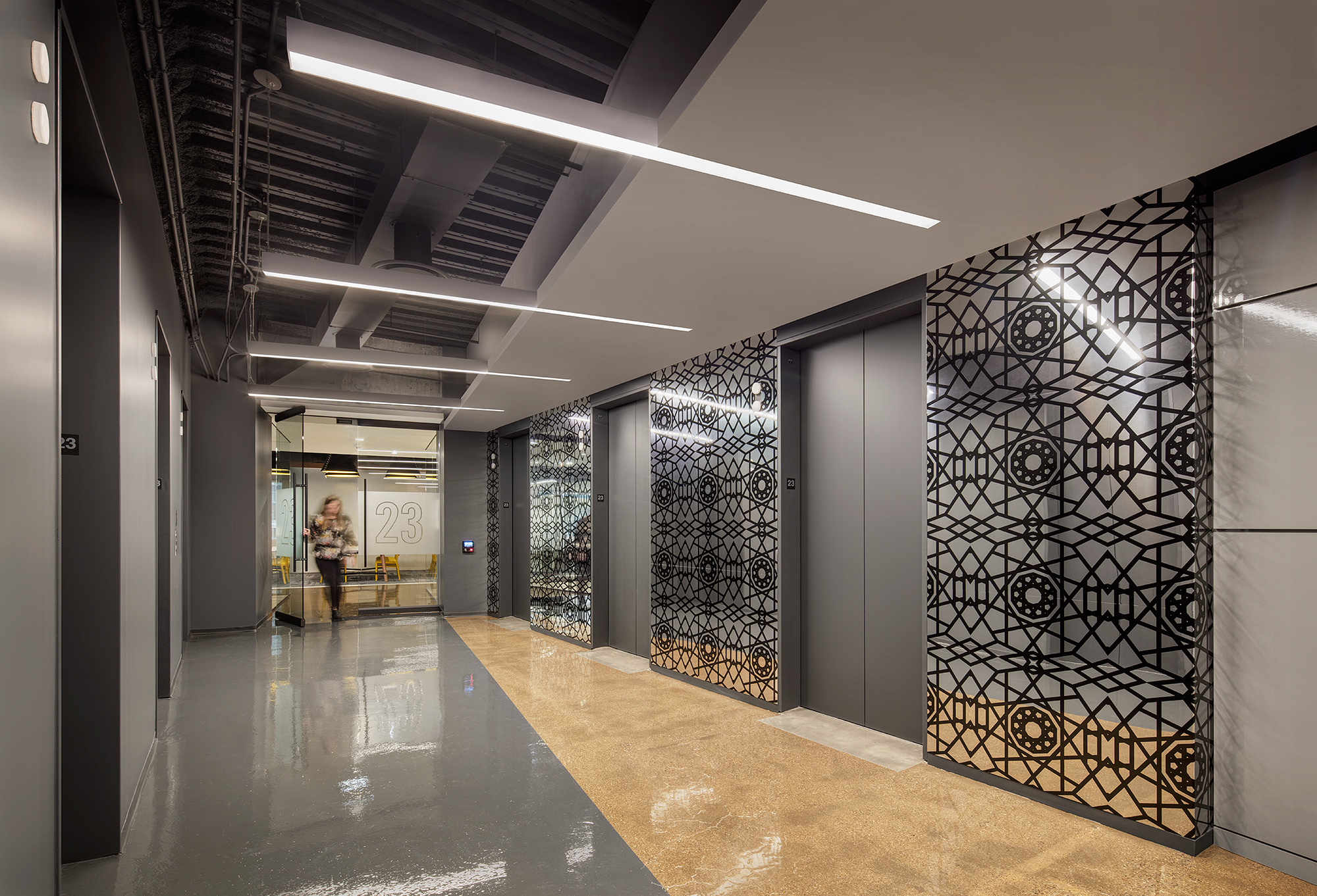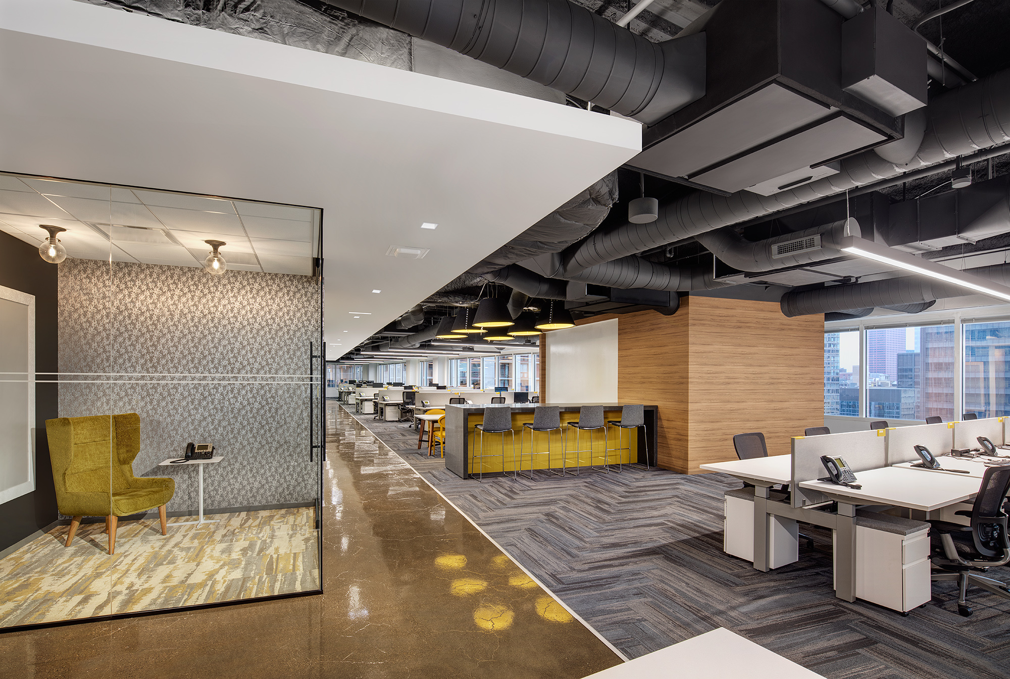 The collaborative space features an industrial, vibrant design and flexible working environments with huddle rooms, modular conference rooms and an open office concept with movable desk configurations.