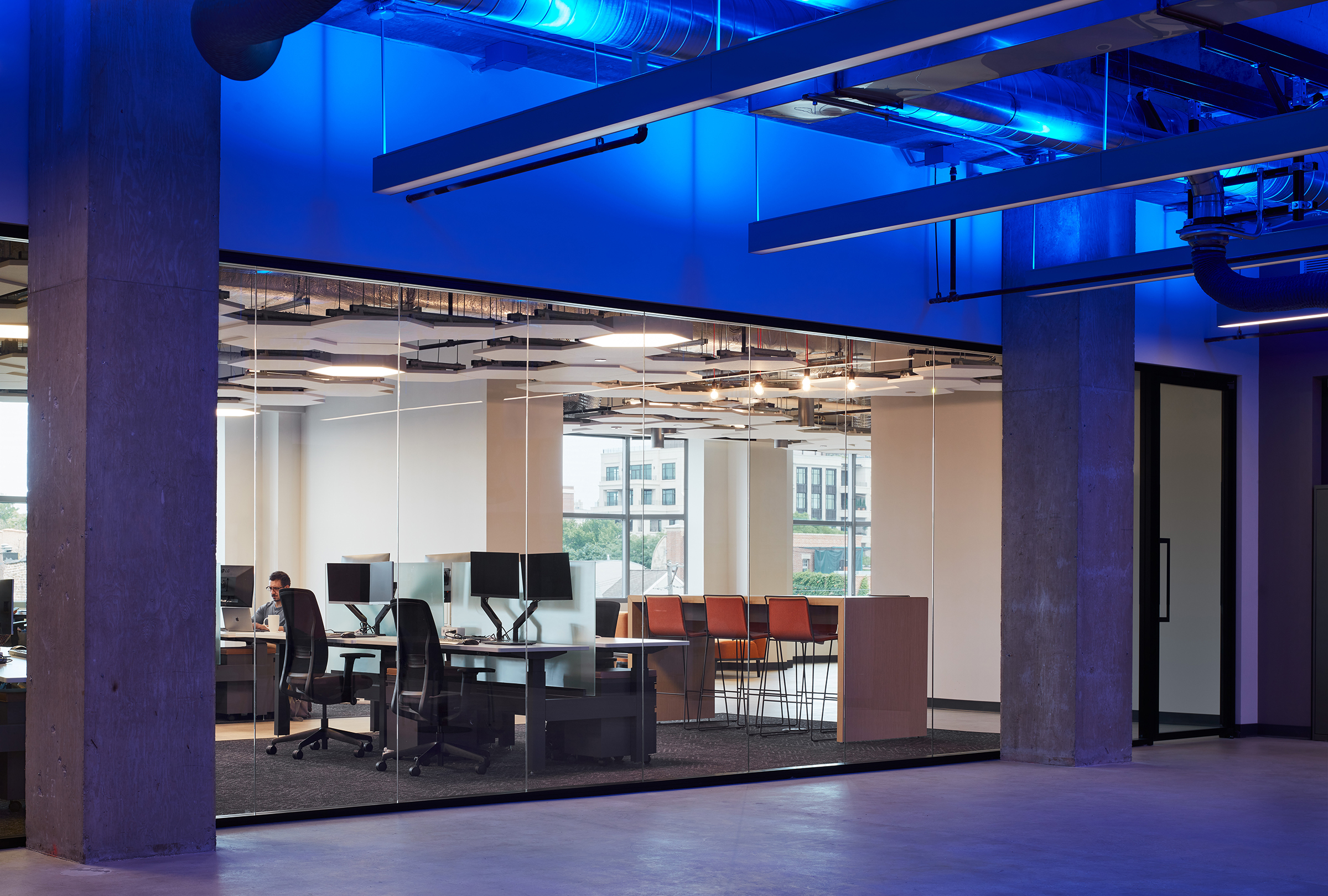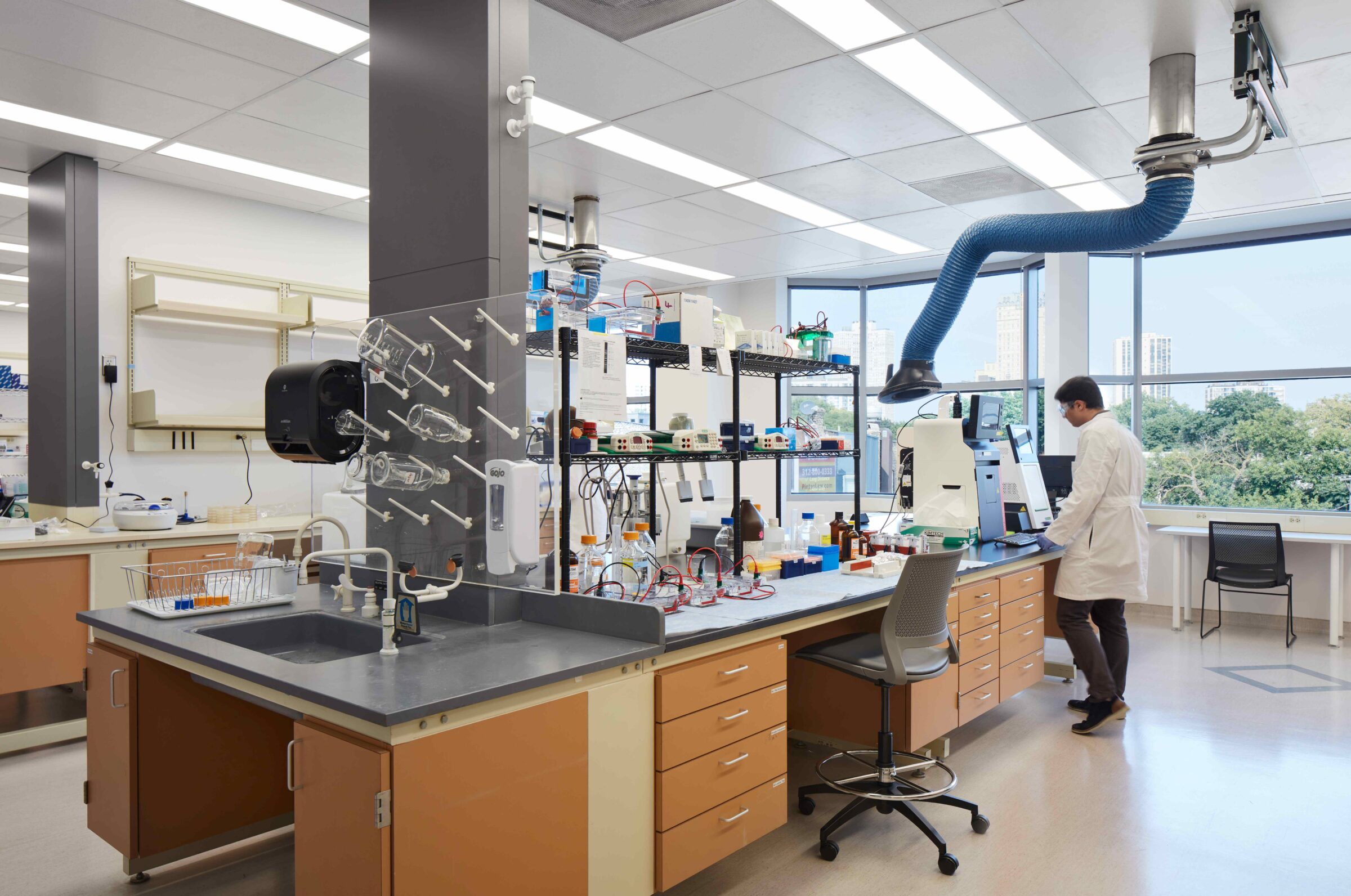 The full-floor workspace features 44 lab stations, 11 fume hoods, two tissue culture rooms with alarming pressurization, an uninterrupted power supply and an automation room for controlled testing.
