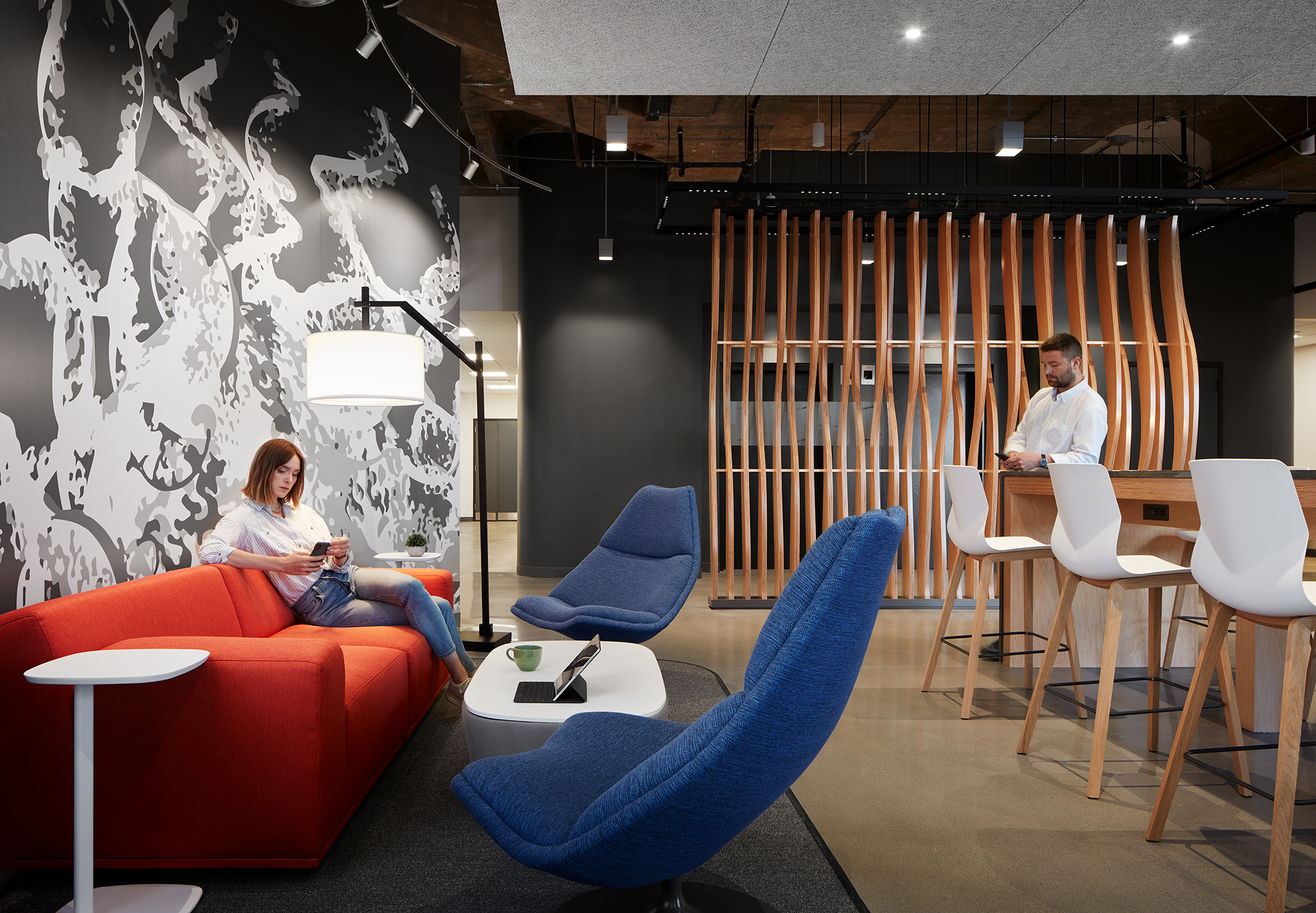 Occupying an entire floor, Exicure’s workspace features 44 lab stations, 11 fume hoods, open-office workstations, two tissue culture rooms with alarmed pressurization, an uninterrupted power supply, and space adapted for a custom-built DNA synthesizer machine. Utility upgrades included the addition of HVAC dampers to the exhaust system, converting pneumatic controls to DDC, and installing an uninterrupted power supply unit for specialty equipment.