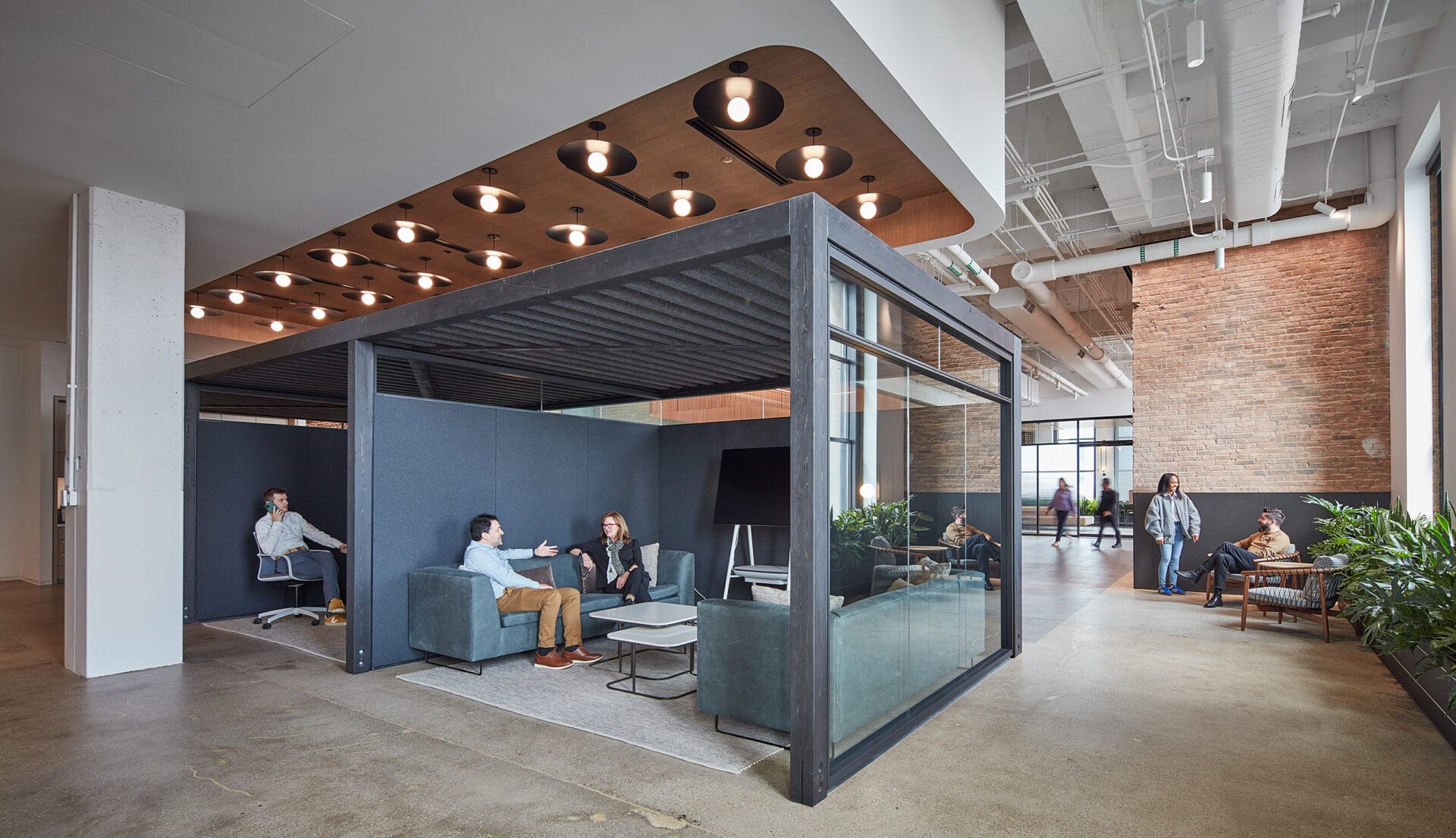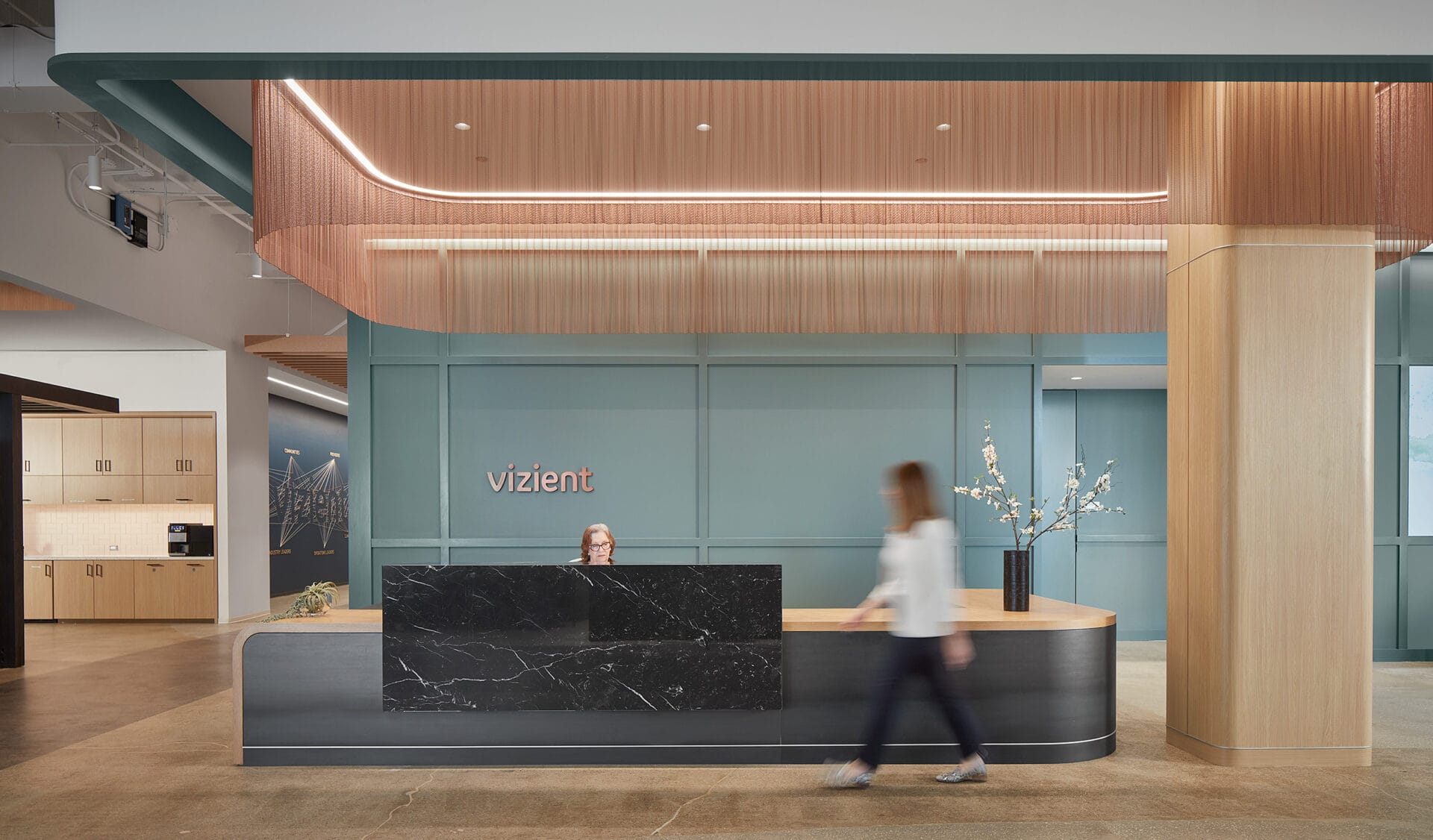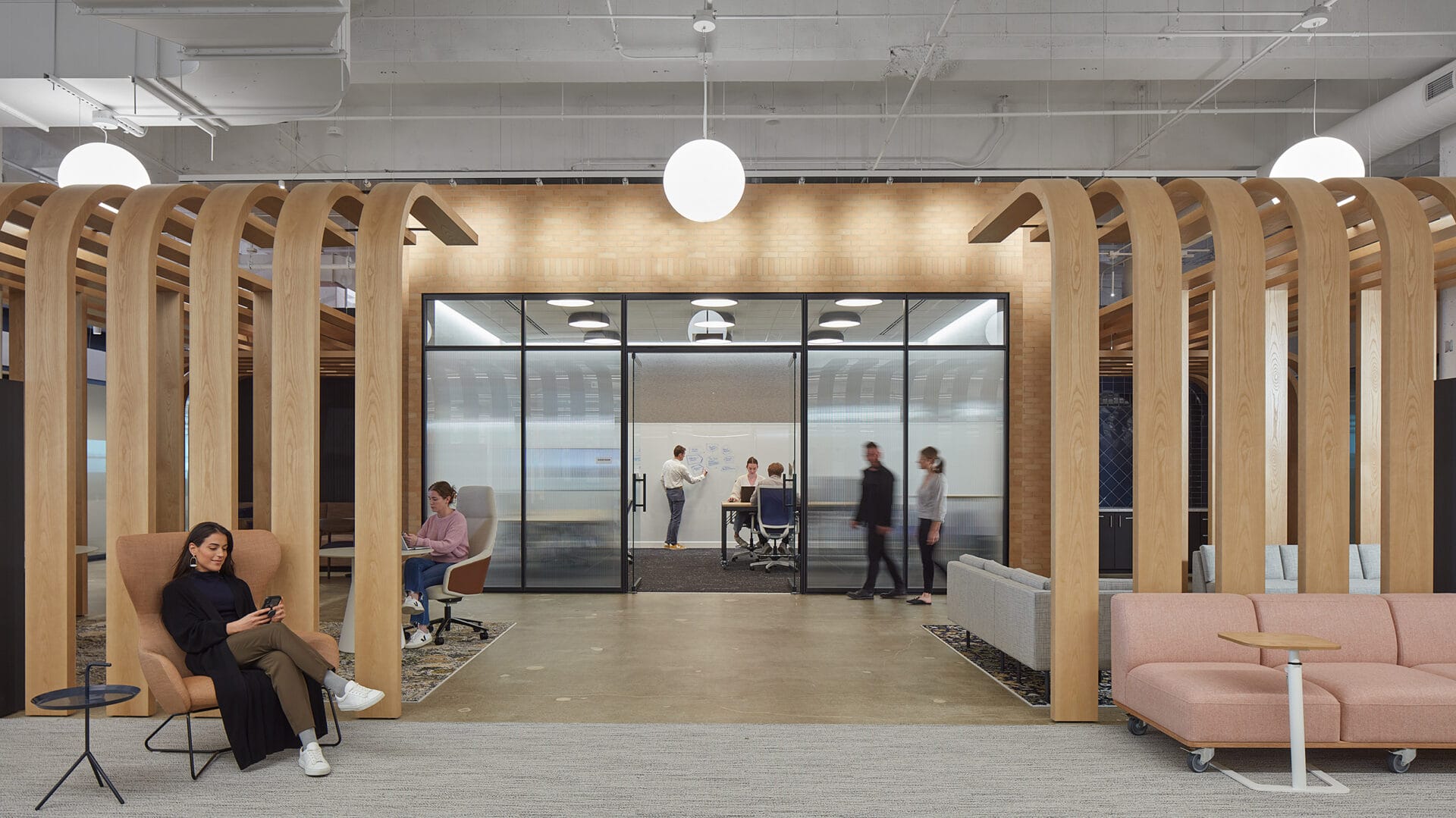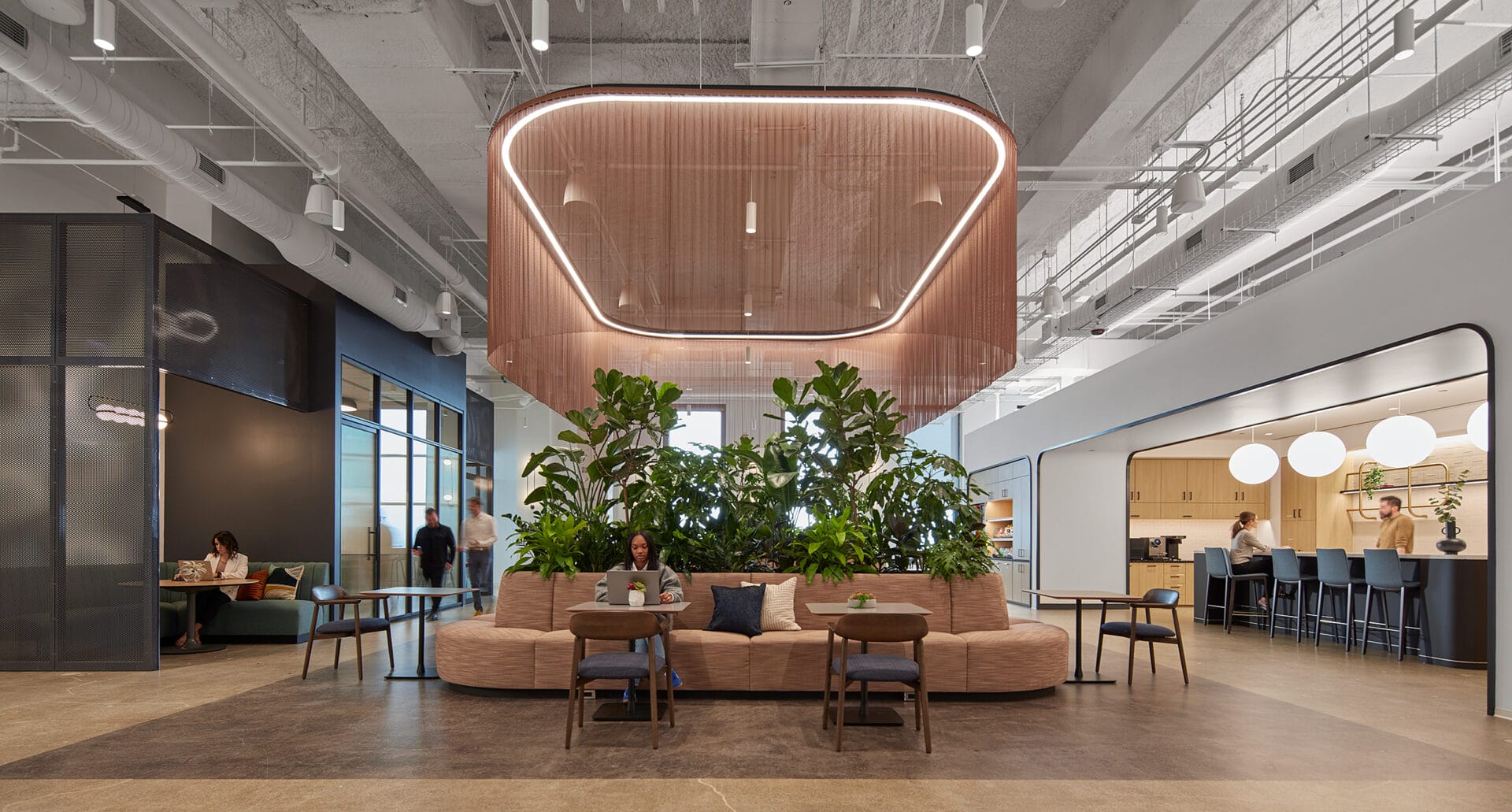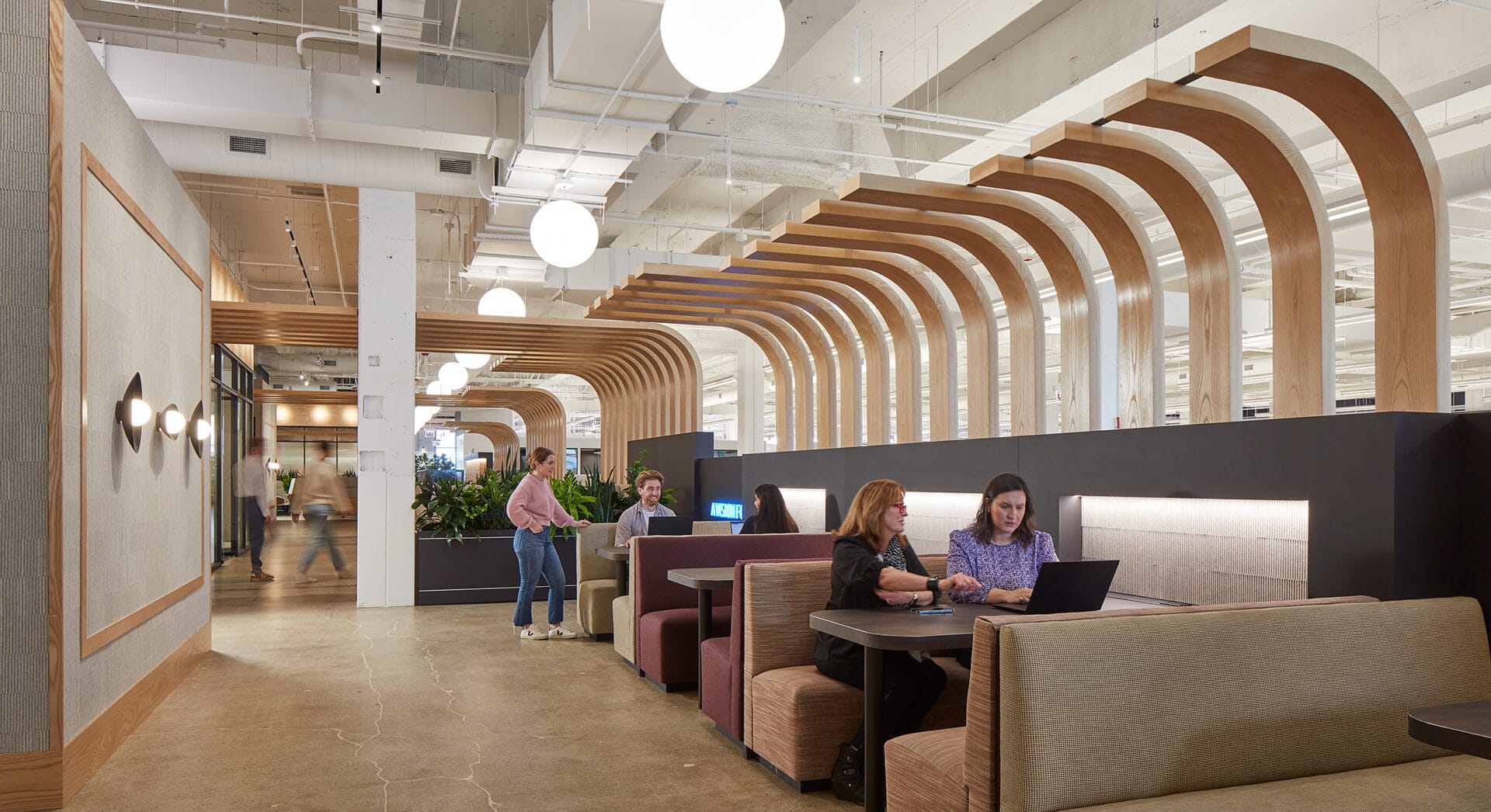 The new office interior is located in the historic Old Post Office and is designed with a “City and Parks” theme, incorporating a variety of building material finishes, extensive greenery, millwork elements reminiscent of tree canopies, park benches and café seating.